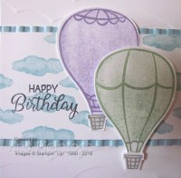 Today’s card is one that I cased from Teri Pocock, a UK Stampin’ Up! Demonstrator. I love the simplicity of this card. I embossed Whisper White card using the High Seas 3D Embossing Folder. The embossed card is attached to Balmy Blue card and then scored and folded Basic Black card. I stamped the cloud image from the Above the Clouds stamp set onto Whisper White card using Balmy Blue ink. I stamped the greeting from the Beautiful Bouquet stamp set onto the left hand side of the stamped Whisper White panel using Memento Tuxedo Black ink. I embossed Balmy Blue card using the Corrugated 3D Embossing Folder and attached it behind the stamped Whisper White card. The panel is attached to the card front. I stamped the outline of one large balloon from the Above the Clouds stamp set using Highland Heather ink and stamped the fill image using the same ink which I had stamped onto scrap paper first.