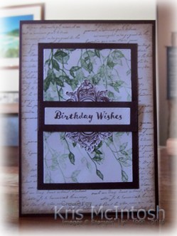Today’s card is one I made for a friend who recently celebrated her birthday. I stamped the background image from the Very Versailles stamp set onto Whisper White card using Crumb Cake ink and sponged around the edges with the same ink. The stamped panel is attached to scored and folded Blackberry Bliss card. I stamped the leaf image from the Very Versailles stamp set onto Whisper White card using Garden Green ink. I stamped the image several times without re-inking to give even more depth to the image. I cut out the leaves using one of the Stitched Rectangle Dies.