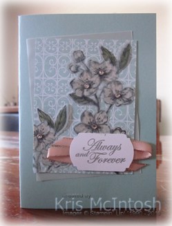 The images are layered onto a piece of the Parisian Blossoms Specialty Designer Series Paper as well as a piece of Vellum card stock before being attached to scored and folded Pool Party card. I stamped the greeting from the Forever Blossoms stamp set onto Whisper White card using Smoky Slate ink and punched it out using the Label Me Fancy Punch. I attached a length of the Petal Pink 1/4″ Metallic Edge Ribbon to the back before attaching the greeting to the card front using dimensionals.