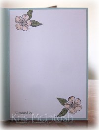 To decorate the inside of the card, I stamped the small flower onto the top left and lower right hand corners of Whisper White card using Memento Tuxedo Black ink. I stamped the same flower onto a post-it-note and cut it out. I masked the flowers and stamped the double leaf image from the Forever Blossoms stamp set using Memento Tuxedo Black ink. I coloured the flowers using Petal Pink Stampin’ Blends and the leaves using Mossy Meadow Stampin’ Blends.