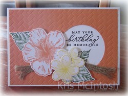 Today I am sharing a card with you that I made using the Timeless Tropical stamp set which will be released very soon now, in the Handmade for You Mini Catalogue. I cased one of the examples from the Mini Catalogue to create my card. I cut a circle from Grapefruit Grove card before embossing it using the Coastal Weave 3D Embossing Folder. The embossed card is attached to scored and folded Thick Whisper White card. I stamped the greeting from the Timeless Tropical stamp set into the circle cut out using Memento Tuxedo Black ink. I also stamped the large single leaf from the Timeless Tropical stamp set into the circle cut out using Garden Green ink.
