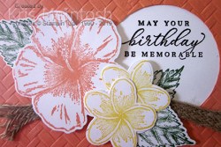 I attached a length of the 5/16″ Braided Burlap Trim across the card front. I stamped the large flower from the Timeless Tropical stamp set onto Whisper White card using Graprefruit Grove ink and cut it out using the co-ordinating In The Tropics Die. I stamped the frangipani flower from the same stamp set onto Whisper White card using Daffodil Delight ink and cut them out using the co-ordinating In The Tropics Die.