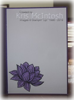 To decorate the inside of the card I stamped the lily image from the Lovely Lily Pad stamp set onto the lower left hand corner of Whisper White card. I coloured the image using the Highland Heather Stampin’ Blends before attaching the panel to the inside of the card.