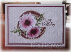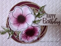 I stamped the leaf image from the Painted Poppies stamp set onto Whisper White card using Memento Tuxedo Black ink. To colour the leaves, I used the small dotted spray to add Old Olive ink and then cut out the leaves. I love the way the variation in colour gives added depth to the leaves. I stamped “happy birthday” from the Peaceful Moments stamp set onto Whisper White card using Rich Razzleberry ink. I punched one short end using the Triple Banner Punch. I attached the leaves, flowers and greeting to the swirly circle before attaching the whole piece to the card front.