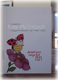 I coloured the image using Old Olive, Rich Razzleberry and Dark Daffodil Delight Stampin’ Blends. I cut out the flower using the co-ordinating Ladybug Dies and attached it to the lower left hand corner of Whisper White card. I attached the last ladybug image to the top of the flower and stamped the greeting from the Little Ladybug stamp set to the right of the flower using Real Red ink. The panel is attached to the inside of the card.