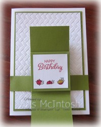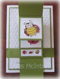 Today’s card uses another one of my favourite fancy folds – the waterfall. I know my grandchildren love getting this kind of card. If you don’t know how to create one of these, you can follow the instructions on Splitcoast Stampers. I embossed a piece of Whisper White card using the Coastal Weave 3D Embossing Folder. The embossed card is attached to Old Olive card and then scored and folded Thick Whisper White card. I cut the mechanism for the card and the cross piece from Old Olive card. I stamped the four ladybug images from the Little Ladybug stamp set onto scrap Whisper White card using Memento Tuxedo Black ink. I coloured the images using Dark Real Red, Dark Old Olive, Dark Daffodil Delight, and Ivory Stampin’ Blends.