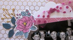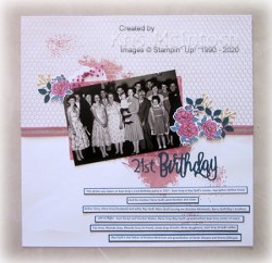 This page showcases a group shot taken at my dad’s cousin’s 21st birthday. I am the baby in the photo! I love scrapping these old photos. When I ask my Mum and Dad to help me out with the people in the photos, I often get told some stories from around the time the photo was taken. It helps me remember things to tell my grandchildren. I attached a piece of the Golden Honey Specialty Designer Series Paper across the top of the Whisper White 12″ x 12″ page. I stamped a couple of the images from the Artisan Textures stamp set across the page using Rococo Rose ink. I wrapped the bottom of the Designer Series Paper with a length of the Rococo Rose 1/2″Scalloped Linen Ribbon. I attached a piece of Rococo Rose Designer Series Paper from the 2019-2021 In-Colour Designer Series Paper Pack to create a kind of photo mat.