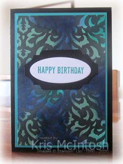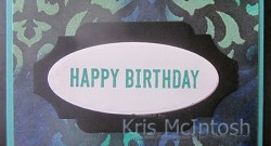 A quick rub with a tissue to remove any Black ink on the embossing and the card was ready to use. I cut the card down to the size I wanted and attached it to Bermuda Bay card and then scored and folded Basic Black card. I stamped “happy birthday” from the Itty Bitty Greetings stamp set onto Whisper White card using Bermuda Bay ink. I cut out the image using the oval die from the Detailed Bands Dies. I