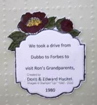 The title is cut from Early Espresso card using the retired Little Letters Dies. I stamped the tag image from the Tags in Bloom stamp set onto Whisper White card using Memento Tuxedo Black ink. I stamped the flower fill images using Cherry Cobbler ink and Daffodil Delight ink and the leaf fill images using Mossy Meadow ink. I cut out the image and attached it to the right hand side of the Vellum. I created the journaling on my computer, printed it onto Whisper White card and punched it out using the Label Me Lovely Punch. The journaling is attached to the centre of the stamped tag. In case you are wondering how I attached the Vellum, well, I only used adhesive underneath the Designer Series Paper and also the tag element. This is sufficient to hold it in place without having adhesive show through it. My grandchildren looked at this photo and thought I was their Mum. You know, Nan could never have been young!