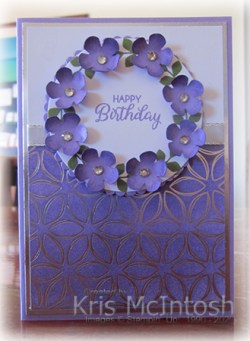 I cut out the stamped images using the largest circle from the Layering Circle Dies. The panel is attached to a Highland Heather scalloped circle cut using the same Dies. I punched eight flowers from Highland Heather card using the Punch. I sponged Highland heather ink onto the edges of the flowers and used my bone folder to give them a bit of a curl. The flowers are attached between the stamped leaves using Mini Glue Dots.