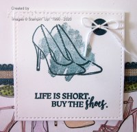 I stamped the shoe image from the same stamp set using Pretty Peacock ink, masked it with a post-it-note image and then stamped the shoe again. I removed the mask and then stamped the background image over the top using Pretty Peacock ink. I did stamp the background image onto scrap paper twice before stamping over the shoes. I cut the button from Pretty Peacock card using the die from the All Dressed Up Dies and attached it to the top right hand corner of the stamped panel. I tied a bow in Whisper White Baker’s Twine and attached it to the centre of the button.