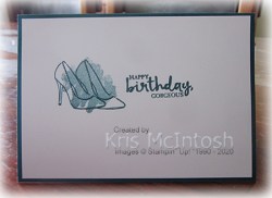 To decorate the inside of the card, I stamped the shoes, as before, using a mask and added the greeting from the Beautiful You stamp set onto Whisper White card using Pretty Peacock ink.
