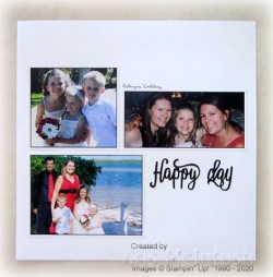 Today I am sharing more photos from the box of old photos. I found the photo of Sarah and Emma with Abigail first and thought how gorgeous all three girls look. Then I found two more photos from the same event. One of Sarah with her husband and children and one of the three children. The photos were taken at my niece’s wedding and Abigail was flower girl. This page couldn’t be more simple. The photos all had a black line around them to give depth, so I just attached each of the photos to a 12″ x 12″ Whisper White page. I cut “happy birthday” from Basic Black card using the retired Happy Birthday Die. I trimmed down “birthday” to give me “day”. I attached the title to the page on the right hand side and used a 0.5 Journaling Pen to add the event.