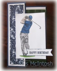 To decorate the long central panels on the top and the bottom of the card, I cut a strip of Garden Green card using my retired Fringe Scissors to give a grass effect. The cut strip is attached to Whisper White card before being attached to the card base. I cut a rectangle from Whisper White card and stamped the golfer image from the Clubhouse stamp set using Memento Tuxedo Black ink.