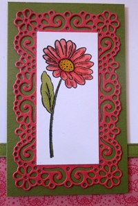 I coloured the flower using Calypso Coral, Old Olive and Dark Daffodil Delight Stampin’ Blends. I trimmed the Whisper White card and attached it to the centre of the Terracotta Tile frame.