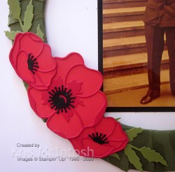 I tore sheets of Mossy Meadow card into strips and wrapped the cardboard. Kind of messy but kind of just right. I cut the solid poppies from Poppy Parade card and the detailed overlays from Real Red card using the Poppy Moments Dies. The flower centres are cut from Basic Black card. I also cut some leaves from Old Olive card using the Poppy Moments Dies. I attached the flowers and the leaves together and added them to my “wreath”. I attached the “wreath” to the Whisper White page. I attached my photo to Basic Black card and placed it inside the “wreath”. I attached a strip of Whisper White card to a slightly wider strip of Real Red card across the bottom of the page. I cut the letters from Basic Black card using the retired Little Letters Dies.