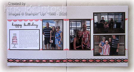 Today’s pages document a lunch we had with two of our Granddaughters who celebrate their birthdays during the month of March. Ron and I were going to be away for both birthdays, so we took them out to lunch before we went. Such a lovely day! I cut Flirty Flamingo with the retiring die from the Seasonal Layers Dies and attached the border behind the edges of some of the Golden Honey Specialty Designer Series Paper, a Sale-A-Bration item.