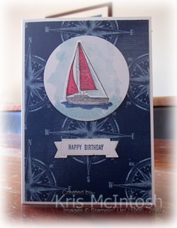 I stamped “happy birthday” from the Itty Bitty Greetings stamp set onto Whisper White card using Night of Navy ink and cut it out using the banner die from the Come Sail Away Dies. The greeting is attached to the card front using dimensionals.