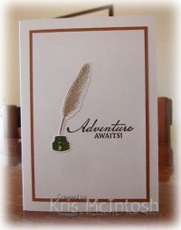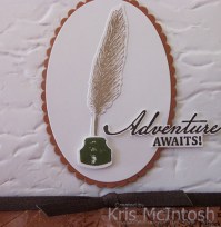 To create my slightly stepped up version for the Casual Stamper, I stamped the inkwell image from the Beautiful World stamp set onto scrap Whisper white card using Mossy Meadow ink and cut it out using the co-ordinating World Map Die. I stamped the feather image from the same stamp set onto scrap Whisper White card using Crumb Cake ink and cut it out using the co-ordinating World Map Die.