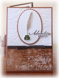 I attached the Whisper White oval to the scalloped oval and then the card front using dimensionals. I stamped the inkwell image from the Beautiful World stamp set onto scrap Whisper White card using Mossy Meadow ink and cut it out using the co-ordinating World Map Die. I stamped the feather image from the same stamp set onto scrap Whisper White card using Crumb Cake ink and cut it out using the co-ordinating World Map Die. I attached the feather to the Whisper White oval and the inkwell over the top of the end of the feather using a dimensional. I stamped the greeting from the Beautiful World stamp set onto scrap Whisper White card using Early Espresso ink. I fussy cut the greeting and attached it to the card front using dimensionals where necessary. To decorate the inside of the card, I attached a piece of the same World of Good Specialty Designer Series Paper across the bottom of Whisper White card. I wrapped the top of the Designer Series Paper using the Early Espresso 1/4″ Faux Suede Trim before attaching the panel to the inside of the card.