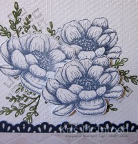 I attached the Designer Series Paper panel to the bottom of the embossed Whisper White card before attaching the whole piece to scored and folded Night of Navy card. I stamped the flower image from the Tasteful Touches stamp set twice onto Whisper White card using Night of Navy ink and cut them out. I attached one flower flat onto the embossed Whisper White card and the second flower using dimensionals.