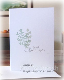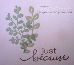 For the Casual Stamper, I stamped the same leafy images using Mint Macaron and Soft Sea Foam ink. I stamped the greeting from the Lovely You stamp set using Basic Gray ink beside the leafy images. I attached the stamped panel to Mint Macaron card and then scored and folded Thick Whisper White card.