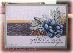I used a tutorial I purchased from Create with Connie and Mary to create today’s card. However, I did change out the Designer Series Paper and the stamp set used for the focal image. So you could say that I used the tutorial for inspiration and the layout. I began by stamping the greeting from the Tasteful Textures stamp set onto the bottom right hand corner of Whisper White card using Night of Navy ink. I stamped the square background image from the Tasteful Textures stamp set across the top right hand side of the stamped Whisper White card using Mint Macaron ink. I embossed the top half of the stamped Whisper White card using the Tasteful Textile 3D Embossing Folder.
