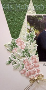 Today’s Memory Keeping page shows off a photo of Sarah and Sean on their Wedding Day with Ron and I. Such a lovely day. I have to admit I am a little obsessed with the new Stitched Triangle Dies and can’t seem to stop thinking about ways to use them. Unfortunately, my card ideas have not been as successful as I would wish yet. However, using them for Memory Keeping seems really easy! Today I cut four triangles from Garden Green card and four triangles from Soft Sea Foam card. I embossed the triangles with the Ornate Floral 3D Embossing Folder once they were die cut.