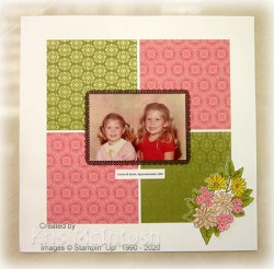 I attached the Designer Series Paper squares to a 12″ x 12″ Whisper White page. I cut Early Espresso card using the Ornate Layers Dies to create the frame for my photo and attached it to the centre of the Designer Series Paper. I created the title on my computer, cut it out using one of the Rectangle Stitched Dies before attaching it to the page below the photo. I stamped the floral image from the Ornate Style stamp set onto Whisper White card using Memento Tuxedo Black ink. I coloured the image using Old Olive, Daffodil Delight, Petal Pink, Flirty Flamingo and Light Soft Suede Stampin’ Blends. I cut out the floral image and attached it to the lower right hand corner of the page.