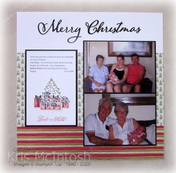 Today’s page shows off a couple of photos from my Abigails first Christmas – I think she was just over one week old, so I am pretty sure she has no recollection of this one! The photos show Sarah holding Abigail, with her Dad and his mother in the top photo and my Mum and Dad with Abigail in the bottom photo. I am excited to reveal that the Most Wonderful Time Product Medley has carried over to the August to December 2020 Mini Catalogue. These photos gave me the perfect opportunity to use this beautiful Product Medley. I attached two pieces of the Most Wonderful Time 6″ x 6″ Designer Series Paper across the centre of a 12″ x 12″ Whisper White page. I cut another piece of the Designer Series Paper in half and attached the pieces across the bottom of the page. I attached the photos to Basic Black card and attached them to the right hand side of the page.
