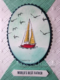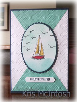 Here I am again with a card I made using the sketch challenge at Freshly Made which unfortunately I didn’t get made to meet the challenge deadline. In any case I love the sketch and I wanted to share my creation with you. I began by cutting a piece of Coastal Cabana card diagonally into four pieces. I attached two pieces to one piece of Whisper White card and embossed the panel using the Absolutely Argyle 3D Embossing Folder. The panel is attached to scored and folded Night of Navy card. I cut an oval from Whisper White card and stamped the boat image from the Sailing Home stamp set using Memento Tuxedo Black ink. I cut a mask for the boat from a post-it-note and covered the stamped image.