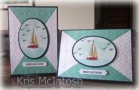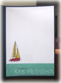 To decorate the inside of the card, I embossed a piece of Coastal Cabana card using the Absolutely Argyle 3D Embossing Folder and attached it to the bottom of Whisper White card. I stamped the boat image from the Sailing Home stamp set onto the left hand side of the Whisper White card just above the embossed panel. I coloured the boat image using the Dark Poppy Parade and Dark Daffodil Delight Stampin’ Blends.