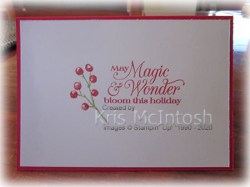 To decorate the inside of the card, I stamped the greeting from the Poinsettia Petals stamp set using Real Red ink. I used the Old Olive Stampin’ Write Marker to add colour to the stems on the berry image and stamped it next to the greeting. I stamped the berry fill image using Real Red ink and I was pretty happy with how the images lined up.