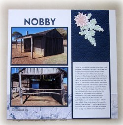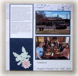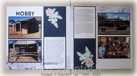 Today’s pages share some more photos of our recent holiday in Toowoomba. We took a drive to Nobby to have lunch at Rudd’s Pub and on the way stopped in to look at a reproduction of Steel Rudd’s home at Emu Creek. Emma and her children joined us for lunch and the next couple of days at Toowoomba. I started with a Whisper White 12″ x 12″ page and added a strip of In Good Taste Designer Series Paper. I embossed a portion of a 12″ strip of Night of Navy card using the Tin Tile 3D Embossing folder before attaching the panel to each page.