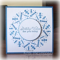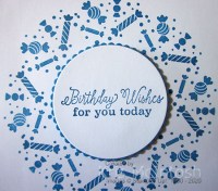 I had another play with the Little Treats stamp set and the Stamparatus. This card is 10.5cm square, which is not the usual card size I would create, however, it is a good size to work with to create a wreath. So, I used the Stamparatus and a wreath template I created long ago to stamp the bon-bon image using Pacific Point ink. I attached the stamped panel to scored and folded Pacific Point card.