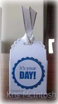 I did add some adhesive to the inside of the front and back just because I wanted it to be a little straighter. I stamped the bon-bon image from the Little Treats stamp set onto scrap Whisper White card using Pacific Point ink and cut it out using one of the Layering Circle Dies. I also stamped “it’s your day” from the Itty Bitty Birthday stamp set onto scrap Whisper White card using Pacific Point ink. The greeting is cut out using the same die from the Layering Circle Dies. I cut Pacific Point card twice using the circle die from the Little Treat Box Dies and attached a stamped panel to the centre of each one. I attached one image panel to each side of the treat box. I used a length of Silver 3/8″ Metallic Edge Ribbon to hold the top of the box together.