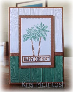 Today’s card uses the Timeless Tropical stamp set, one I have neglected for a little while. Sometimes when a new catalogue launches you forget about the stamp sets sitting on your shelf! This one was inspired by one I found on Pinterest by Melissa Kerrman. Of course it doesn’t really look like Melissa’s card but it certainly inspired me to get creative, so thank you Melissa. I attached a piece of Just Jade card across the bottom of Whisper White card before embossing the panel using the Pinewood Planks Embossing Folder. I wrapped the top of the Just Jade card using the Cinnamon Cider In-Colour Ribbon before attaching to scored and folded Cinnamon Cider card.
