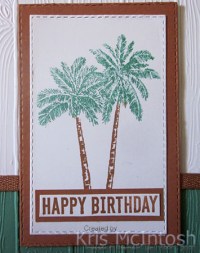 I inked the palm tree image from the Timeless Tropical stamp set using Just Jade and Cinnamon Cider Stampin’ Write Markers. I cut out the image using one of the Stitched Rectangle Dies. I also cut a rectangle from Cinnamon Cider card using the same dies. I attached the image rectangle to the Cinnamon Cider rectangle and then the card front using dimensionals.