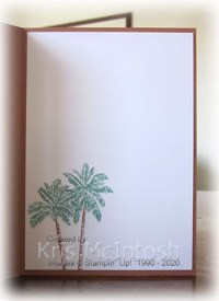 To decorate the inside of the card, I inked the palm tree image from the Timeless Tropical stamp set using the Just Jade and Cinnamon Cider Stampin’ Write Markers. The image is stamped onto the lower left hand corner of Whisper White card.