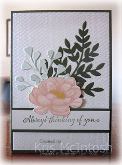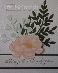 Today’s card was created after I had done some preparation work for a memory keeping project but in the end didn’t use the pieces. So I thought I would create a card for a special friend. I embossed Very Vanilla card using the Tasteful Textile 3D embossing Folder and attached it to scored and folded Mossy Meadow card. I attached the Mossy Meadow leaf and the Soft Sea Foam leaf cut using the Forever Flourishing Dies to the card front. I stamped “always thinking of you” from the Very Versailles stamp set onto Very Vanilla card using Mossy Meadow ink. I attached the greeting to Mossy Meadow card and then the card front over the ends of the die cut leaves using dimensionals.