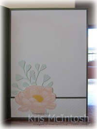 To decorate the inside of the card, I attached a leaf cut from Soft Sea Foam card using the Forever Flourishing Dies to the lower left hand corner of Very Vanilla card. I attached a narrow strip of Mossy Meadow card behind one long edge of a strip of Very Vanilla card embossing using the Tasteful Textile 3D Embossing Folder. The embossed panel is attached to the bottom of the Very Vanilla card covering the end of the die cut leaf. I stamped the flower from the Tasteful Touches stamp set onto Very Vanilla card using Petal Pink ink. I coloured the flower using the Dark Petal Pink and Dark Daffodil Delight Stampin’ Blends. The flower is attached over the embossed card.