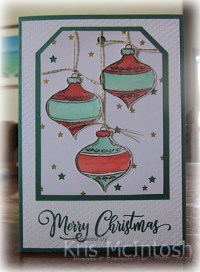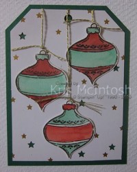 I stamped the bauble image from the Tag Buffet stamp set onto Shimmery White card three times using Memento Tuxedo Black ink. I coloured the images using a Water Painter and Real Red and Shaded Spruce ink. I attached lengths of Gold Twine to the back of each of the baubles and attached them to the tag. I attached the tag to the card front. I wrapped a small piece of Gold Twine around the top of the baubles and tied a knot.