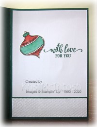 To decorate the inside of the card, I added the greeting from the Tag Buffet stamp set using Shaded Spruce ink. I embossed Whisper White card as before and attached a narrow strip of Shaded Spruce card behind one long edge. The panel is attached to the bottom of the stamped card. I stamped the bauble onto Shimmery White card using Memento Tuxedo Black ink. I coloured the image as before, cut it out and attached it to the left of the stamped greeting.