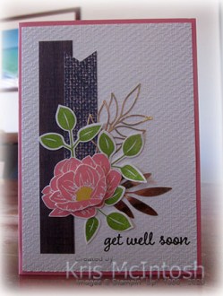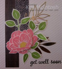 I needed to make a card for a friend who has been feeling unwell and used the now closed Hand Stamped Sentiments sketch challenge to create this card. I stamped the greeting from the Timeless Tulips stamp set onto the lower right hand corner of Very Vanilla card using Early Espresso ink before I embossed the panel using the Timeless Texture Embossing Folder. The embossed panel is attached to scored and folded Flirty Flamingo card. I attached one strip of In Good Taste Designer Series Paper to the left hand side of the embossed panel. I punched a “v” in one end of another strip of In Good Taste Designer Series Paper using the Triple Banner Punch and attached it over the first piece of Designer Series Paper. I removed two of the die cut leaves from the Forever Gold Specialty Designer Series Paper and attached them to the card front. I stamped the leaf image from the Floral Essence stamp set onto Very Vanilla card three times using Granny Apple Green ink.