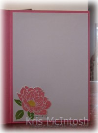 To decorate the inside of the card, I stamped the leaf image from the Floral Essence stamp set onto the lower left hand corner of Very Vanilla card. I stamped the large and the small solid flowers onto Very Vanilla card using Flirty Flamingo ink and cut them out. I coloured the centre of the small flower using the Dark Daffodil Delight Stampin’ Blend. I attached the small flower to the centre of the large flower and attached them to the Very Vanilla card so that covered the end of the stamped leaf.