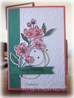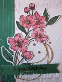 The current challenge at the Papercraft Crew was my inspiration for today’s card.   I embossed Whisper White card using one of the Greenery Embossing Folders and attached it to scored and folded Flirty Flamingo card.  I attached a strip of Just Jade In-colour 2020-2022 6″ x 6″ Designer Series Paper onto the left hand edge of the embossed Whisper White card.  I stamped the flower from the Forever Blossoms stamp set onto Whisper White card using Memento Tuxedo Black ink.  I coloured the flowers using Flirty Flamingo Stampin’ Blends and the leaves using Just Jade Stampin’ Blends and cut out the flower using the co-ordinating Cherry Blossoms Die. I attached a length of the Gold Twine from the Forever Greenery Trim Combo Pack to the back of the flower.  I stamped the greeting from the Timeless Tulips stamp set onto Just Jade card using Versamark ink.  I sprinkled the greeting with Gold Embossing Powder and heat set it. I cut a “v” in each end of the Just Jade card using the Triple Banner Punch.  I attached the greeting to the card front using dimensionals.  I added some Basic Rhinestones to the flower centres and around the Gold Twine.