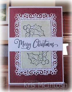I cut the stamped Whisper White card using one of the Stitched Rectangle Dies. I stamped the holly image from the Christmas Gleaming stamp set onto the die cut card using Memento Tuxedo Black ink.