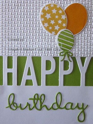 I stamped the solid balloon from the So Much Happy stamp set onto scrap Whisper White card using Mango Melody ink and cut it out using the co-ordinating Happy Die. I stamped the starry balloon image onto scrap Whisper White card using Daffodil Delight ink and cut it out using the co-ordinating Happy Die.