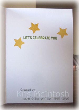 I stamped the striped balloon image from the So Much Happy stamp set onto scrap Whisper White card using Granny Apple Green ink and cut it out using the co-ordinating Happy Die. I attached the three balloons to the top right hand side of the embossed card. I cut “birthday” from Granny Apple Green card using the Well Written Dies and attached it below the die cut “happy”. I also cut the small bow from Granny Apple Green card using the Happy Dies and attached it to the striped balloon. To decorate the inside of the card, I stamped “Let’s Celebrate You” from the Itty Bitty Birthday stamp set using Granny Apple Green card. I also stamped the star image from the So Much Happy stamp set three times using Daffodil Delight ink.