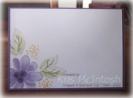 To decorate the inside of the card I stamped the flower from the Gorgeous Posies stamp set onto the lower left hand corner of Whisper White card using Highland Heather ink. I stamped the flower centres using Gorgeous Grape and Rich Razzelberry ink. I added a couple of leaves stamped using Soft Sea Foam and Pear Pizzazz ink and also the dotted image using So Saffron ink.